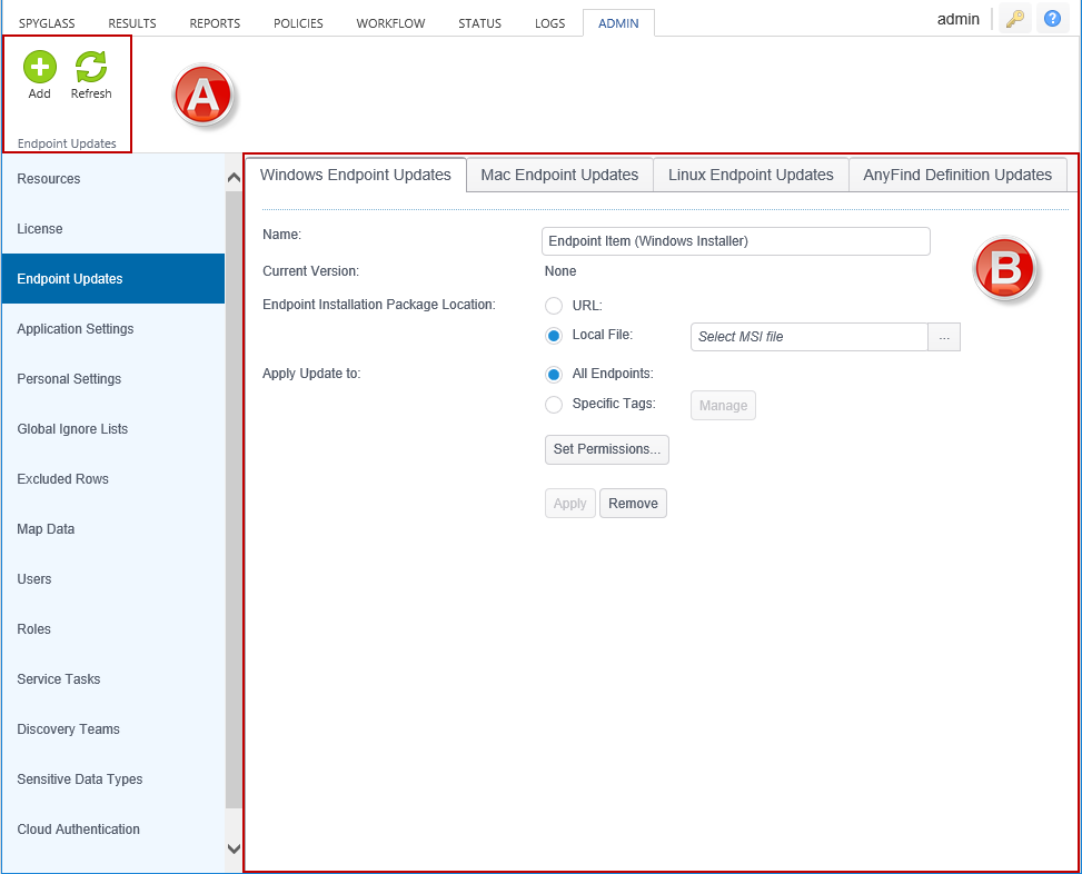 - The Endpoint Updates View: Used to deploy updates to Agent software, AnyFind definitions and license files.