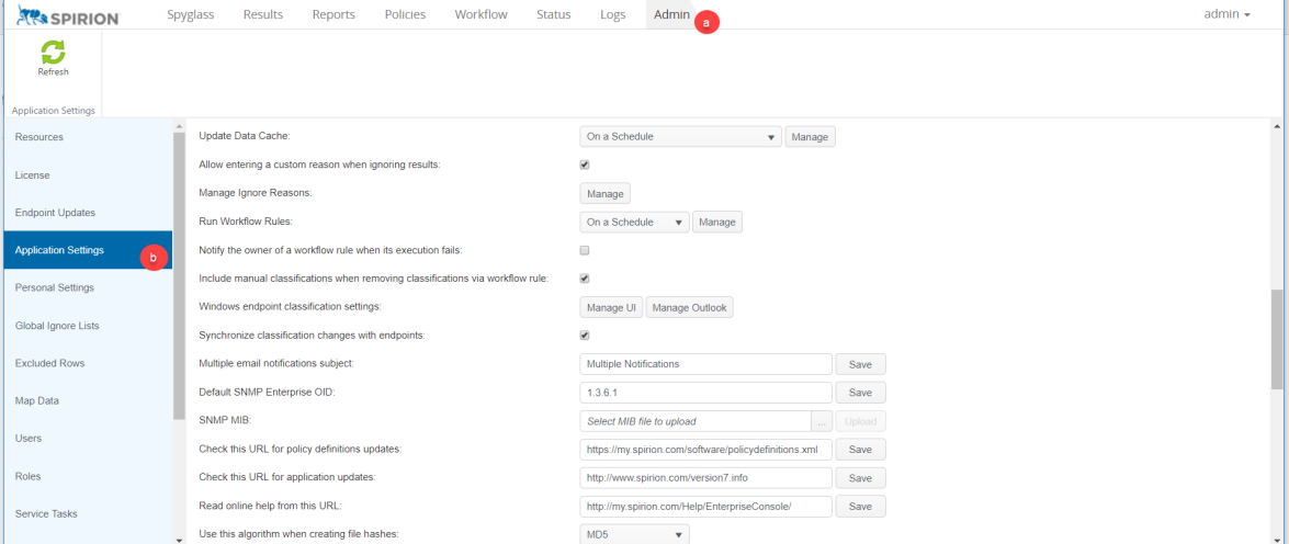 The Application Settings page is used to configure certain aspects of the Console such as what company name to display in reports, when results import into the Console, whether to mask identity matches, and which URL to check for updates.