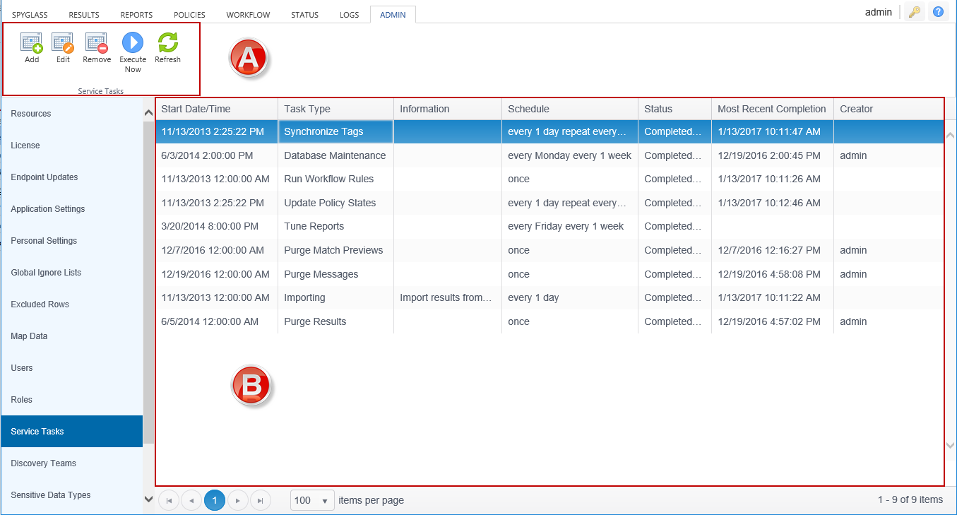 The Service Tasks page allows you to create, edit, remove and execute service jobs and displays each of the service tasks and their status.