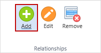 The Relationships group provides functions to add, modify, and remove relationships (joins) to other reports.