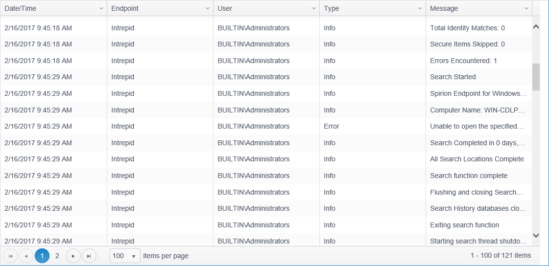 | User | This column displays the name of the user who was running the Spirion Enterprise Endpoint session that performed the log message. |