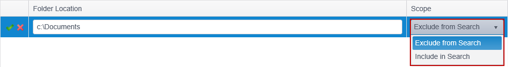Click the Scope field and select whether to include or exclude the folder from the search from the drop down. To accept the custom folder location and add it to the Custom Folders list hit the Enter key or click the green checkmark. To discard it click the red X.