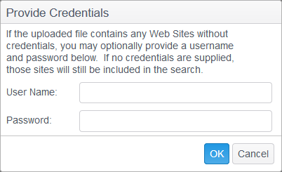 When you click the Import button and select a CSV file, the Provide Credentials dialog displays and you are prompted to enter a User Name and Password even if all entries in the file contain one. The credentials are used only for entries where User Name and Password are missing. If you do not enter a User Name and Password at the prompt and just click OK, then only those entries in the file that already contain them have one. The User Name and password are used to authenticate to the imported locations.