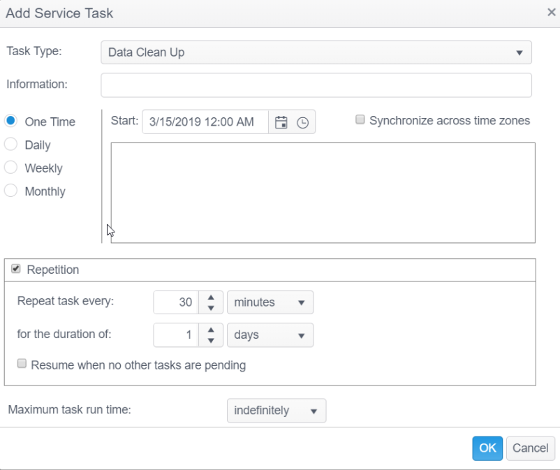 Specify the amount of time that the service task has to complete. For example, if you set the Maximum task run time to 5 minutes, after 5 minutes has elapsed from the time the service task first executes, the service job stops and its status shows as Aborted. The default setting is indefinitely. The following options are available:
