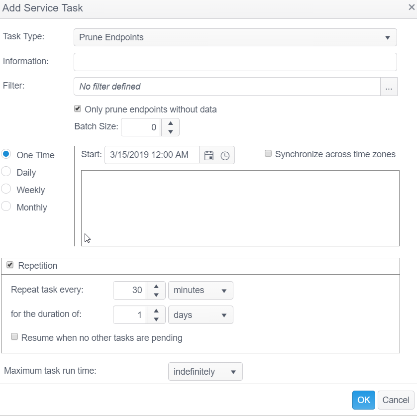 | Only prune endpoints without dataResume when no other tasks are pending | When selected, only endpoints without data are pruned. The default is to only prune endpoints without data. To prune all endpoints, regardless of whether or not they have data, uncheck this checkbox.When selected, the "Repeat task every:" is ignored when no tasks are pending and the task starts immediately. |
