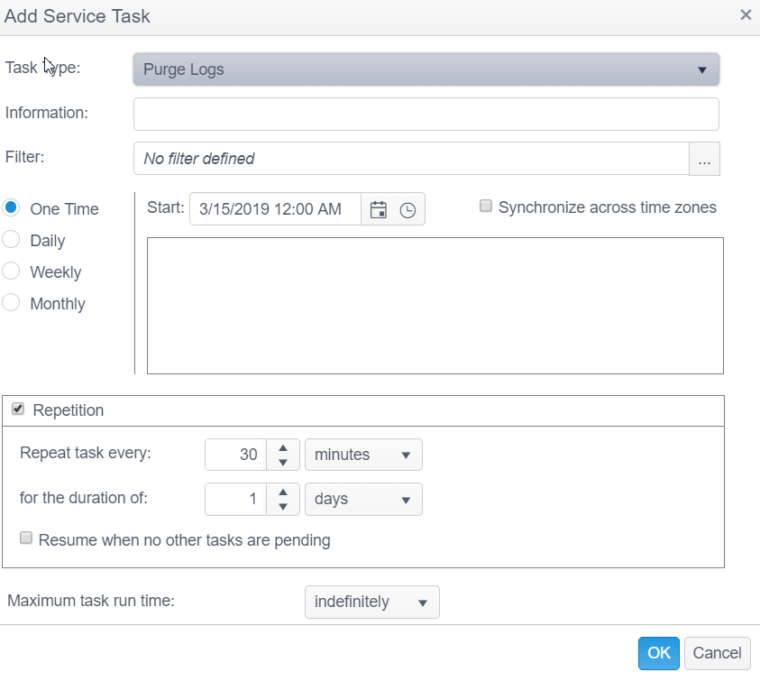 | Information | This text field is used to provide a description of the purpose of the Purge Logs task being created and is only present to help users manage their tasks. |