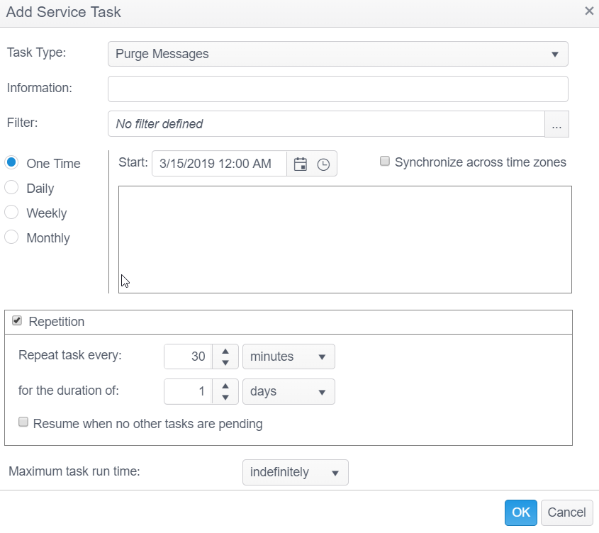 | Information | This text field is used to provide a description of the purpose of the Purge Messages task being created and is only present to help users manage their tasks. |