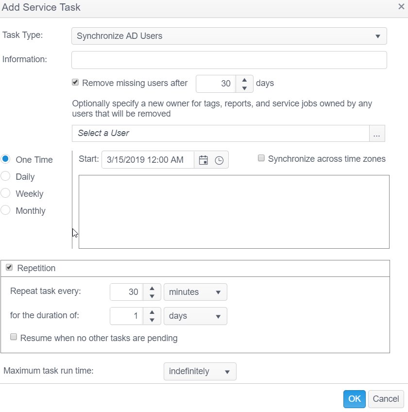 | Optionally specify a new owner for tags, reports, policies and service tasks owned by any users that will be removed | When a user account is deleted from the Console by the Synchronize AD Users service task, any tags, reports or service tasks that were owned by that user are also deleted. If you want to preserve those tags, reports and service tasks you may select a new owner to assign them to by clicking on the '...' and placing a check mark in the box next to the new owners name. Policies are not removed if a new owner is not specified. |