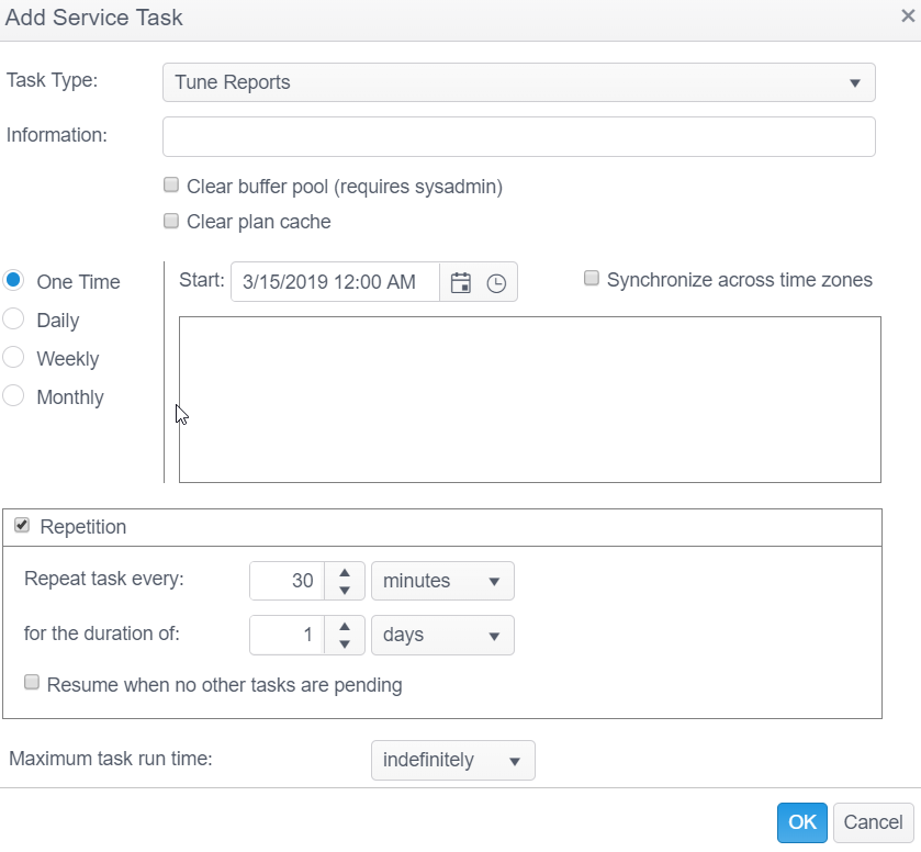 | Tune Reports | The Tune Reports Service Task runs report queries multiple times using CTE and temp tables in turns. Every query is run twice and the time that each query takes to run is measured to determine which is the most accurate. When you create the Tune Reports Service Task you have the options to clear the buffer pool and clear the plan cache. Clearing the buffer pool requires sysadmin privileges while clearing the cache requires ALTER SERVER STATE permission. If neither option is selected, the Tune Reports service task still runs and tune the reports, but it is not as accurate. |