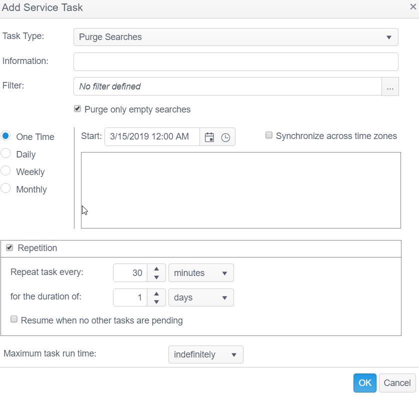 | Purge only empty searches | When this option is selected, no results are purged, only empty searches matching the filter. This option is enabled by default. If this option is not enabled a Filter must be applied or the task does not remove any data. |