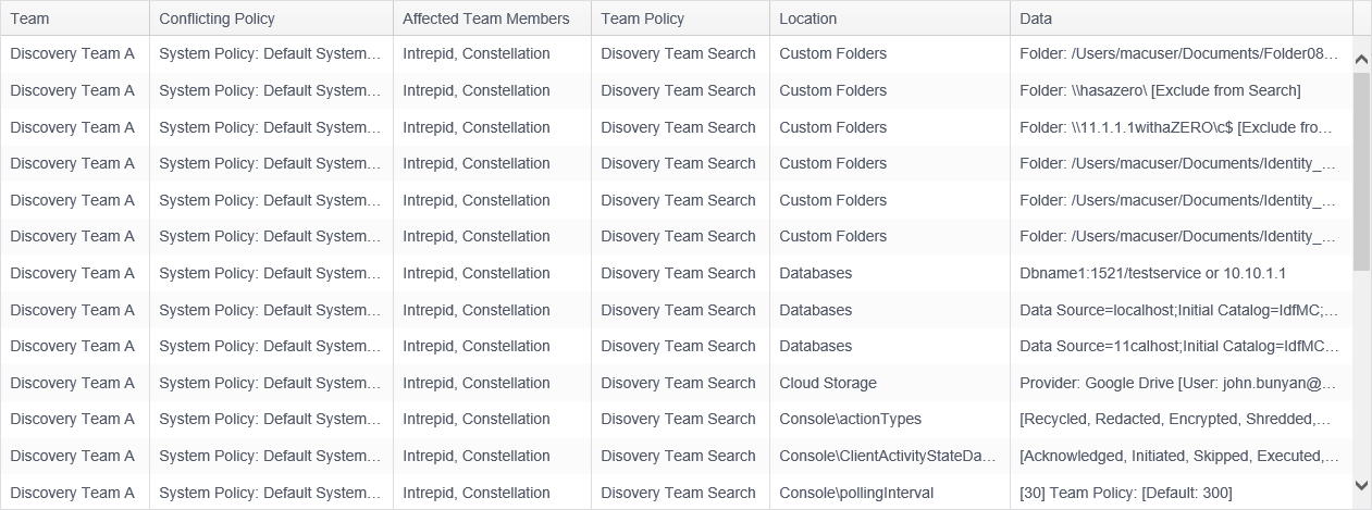 | Data | The Search Location value (e.g. custom folder, database connection string, etc.) from the conflicting policy or the setting value from both the conflicting policy and team policy. |
