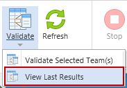 If you have selected a different Discovery Team or refreshed the list of Discovery teams or have navigated away from the Discovery Teams tab, View last Results displays your last validation results. This button is enabled after you validate a team.