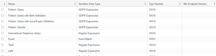 Sensitive Data Types can be created by directly entering information on the Sensitive Data Types page of the Admin tab. Any Sensitive Data Types that you have created displays here. There are five types of Sensitive Data Types.