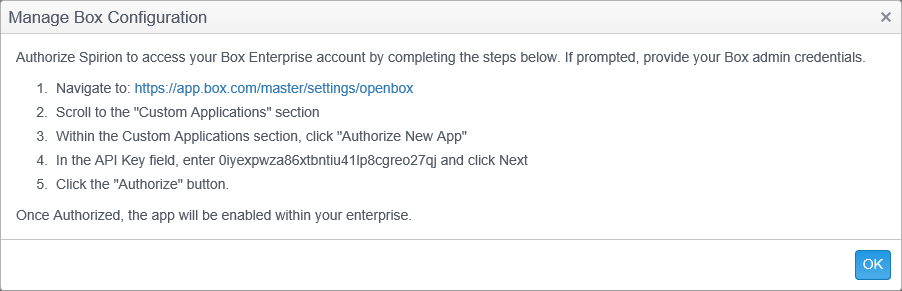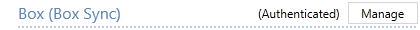 - Follow the instructions and then click OK and the authorization is complete and Box (Box Sync) now displays (Authenticated).