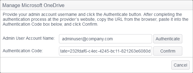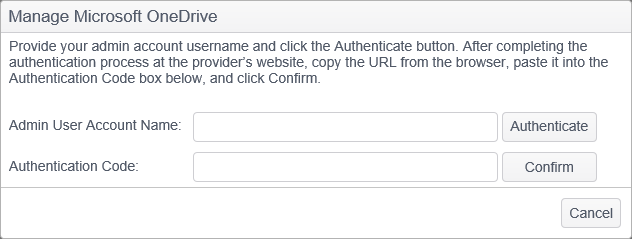 To add or edit the credentials for a Microsoft OneDrive account click the Manage button and the Manage Microsoft OneDrive dialog displays.