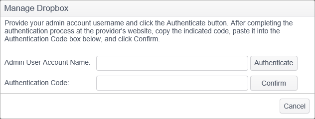 To add or edit the credentials for a Dropbox account click the Manage button and the Manage Dropbox dialog displays.