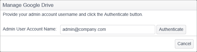 - Enter your admin user account name and click the Authenticate button. When your Google Drive credentials have been successfully authenticated the following dialog box displays:
