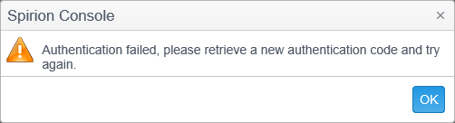 If your authentication code was entered incorrectly the following dialog box displays after clicking the Confirm button.