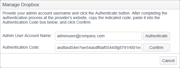 The Dropbox admin account credentials required to access your Dropbox cloud storage locations are specified here. The user accounts to search are specified on the Cloud Storage section in the Search Locations section of the Policy View.