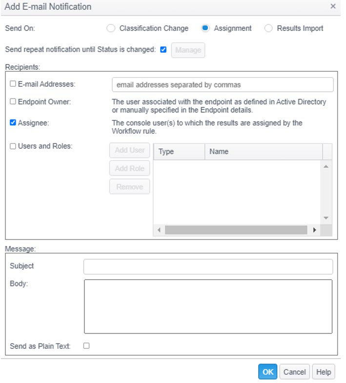 - Assignment: Select this option to have the email notification sent when a result has matched a rule and is assigned to a user, role or endpoint. If a subsequent search is performed on the endpoint and the same results are imported again, then another notification is not sent out when the workflow rules are run unless the assignment for the results has changed.