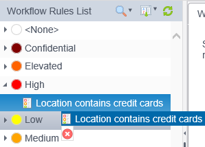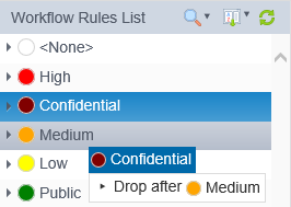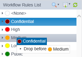 The classification of a rule in the Workflow Rules List can be changed using drag and drop by clicking on a Workflow Rule, holding down the left mouse button and dragging the rule onto another Classification icon. The order of precedence of Classifications can also be changed by dragging and dropping them before or after other classifications.