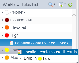 To change the classification of a workflow rule, click and hold on a workflow rule icon and then drag it onto another classification until you see Drop in <classification name>, and then release the mouse button. The workflow rule is moved from the source classification to the destination classification.
