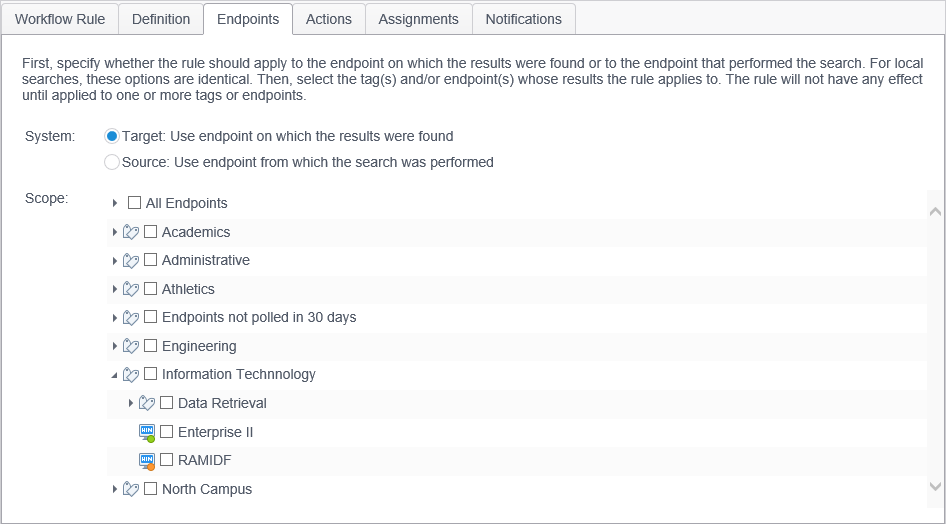 For a rule to have any effect, it needs to be assigned to an endpoint. A rule may be assigned to one or more endpoints and/or tags. When assigned to a tag, the rule is assigned to all of the endpoints and any sub-tags within that tag. You must select at least one tag or endpoint.