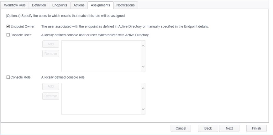 | Endpoint Owner | The Endpoint Owner is the user or users associated with the endpoint as manually specified in the Endpoint Details or defined in Active Directory. To select the endpoint owner(s) as the assignee, place a checkmark in the checkbox to the left of "Endpoint Owner:" by clicking on the checkbox. |