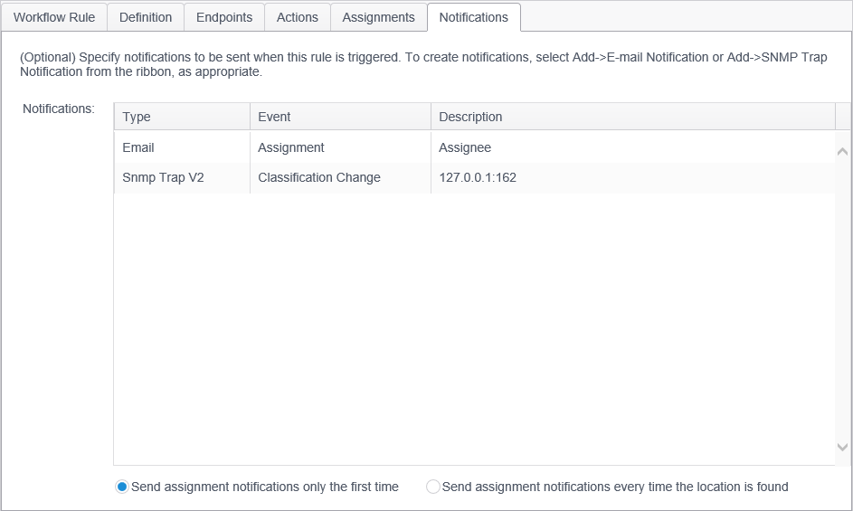 | Send assignment notifications only the first time | Select this setting to have the notification sent only the first time a location is found and assigned. This is the default setting. |