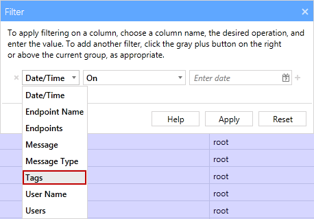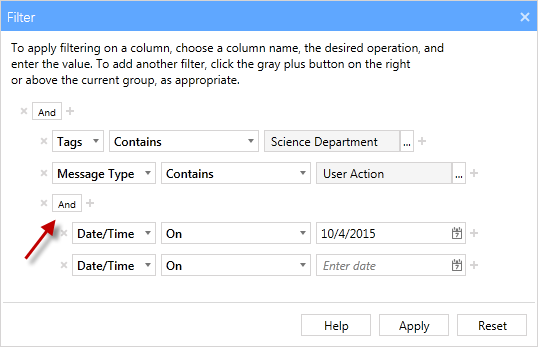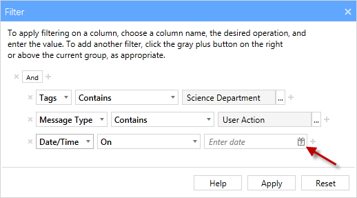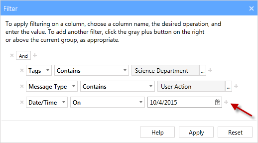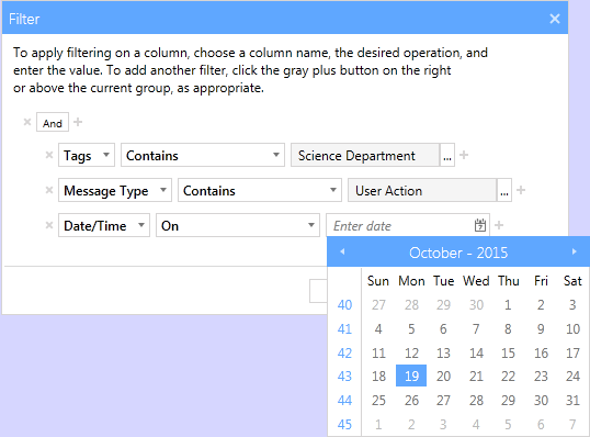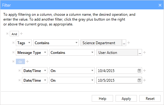- For this second Date/Time filter, change the operator to On and select another date . The filter is now complete and displays only the logs from 10/04/2015 OR 10/05/2015 AND which have a Message Type of User Action AND are part of the Science Department tag.