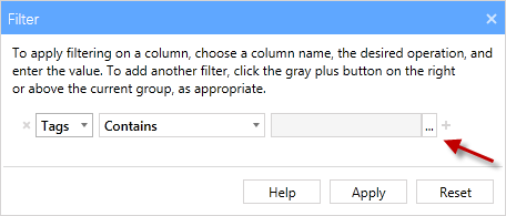 - When the filter dialog opens click the filter type and select Tags from the drop-down.