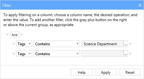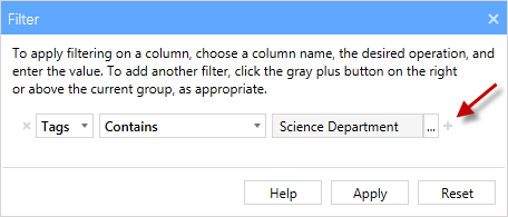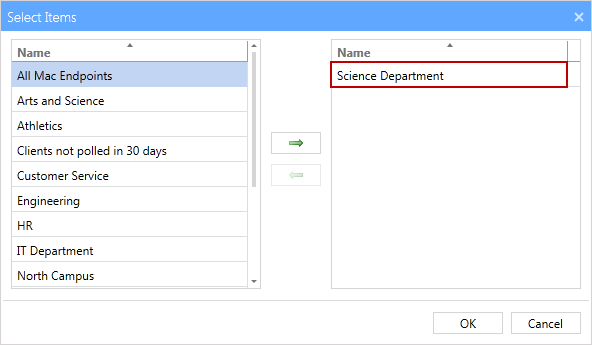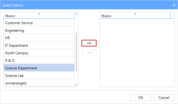 - The left column shows the items that are available but not currently part of the filter. The right column shows items that have been selected for the filter. From the left column select a tag(in our example we have chosen the Science Department' tag), then click the right arrow button to add the selected tag to the filter and the tag name is moved to the include column. You can select multiple tags by holding down the Ctrl button while left clicking the mouse.