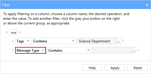 - On the new filter, click on the filter type and select Message Type from the drop-down. Leave the operator as Contains and the click on the '...' button to open the Select Items dialog.