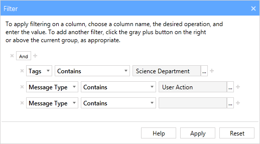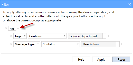 - If we leave the filter the way it is, it would show only those logs which are part of the Science Department tag and that have a message type of User Action. But as we want to add additional qualifiers to this filter, click the plus button to the right of the And operator.