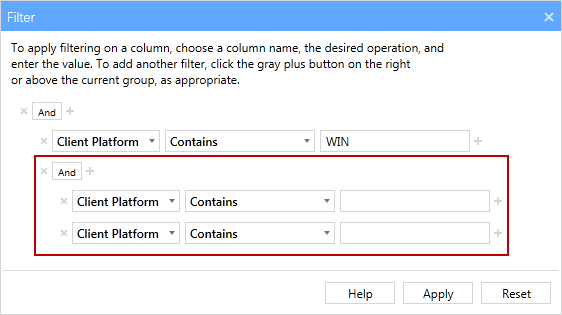 Each time you click the plus button, it adds another filter, but it also adds an Operator. When there are multiple filters there must be at least one operator, either And or Or. When you click a plus button to the right of a filter, an additional operator is added directly above that filter and a new filter is added below it. In the example above, clicking the plus button on the bottom filter adds a new operator directly above that filter and a new filter directly below it forming a new operator group as is shown below.