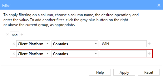 - Select Agent Platform from the column name drop-down list, Equals from the operation drop-down list and enter ‘WIN’ in the value field. (Windows Agents running on a 32 bit OS would be stored as WIN32 and would therefore not be included in these results.) If you wanted to include all Agents running on a Windows platform you would select Begins With from the operation drop-down and enter WIN in the value field.