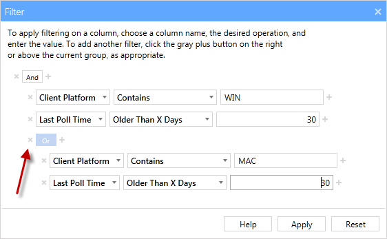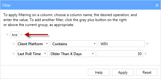 - Above the column filters is an operator which can be set to either ‘And’ or ‘Or. Make sure the operator is set to ‘And.’ If you choose ‘Or,’ your results show you all Agents running Windows as well as all Agents that have not been polled within the past 30 days.