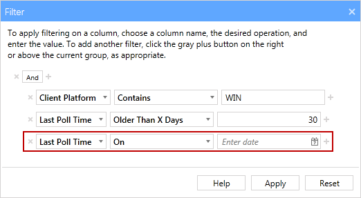- For the second filter, select Last Poll Time from the column name drop-down list, select Older Than X Days from the operation drop-down list and enter 30 in the value field.