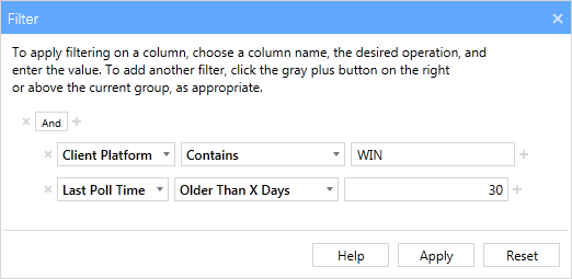 - Next, add a second column filter to limit the results to those Agents that have not been polled within the past 30 days. Click the gray plus button on the right and a new column filter appears.