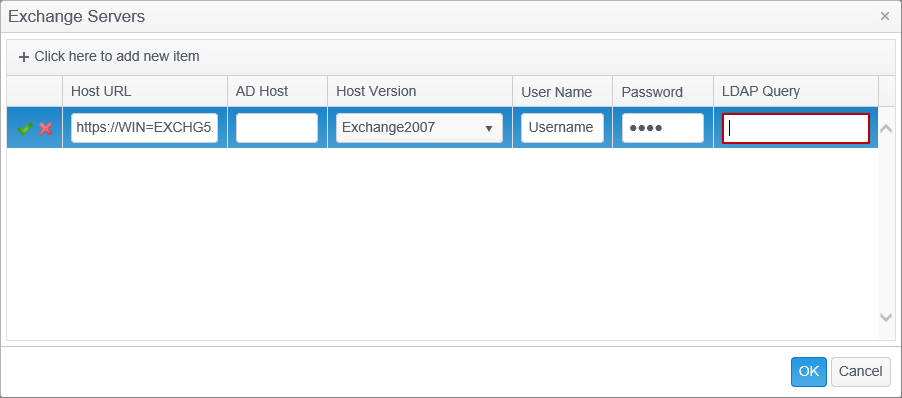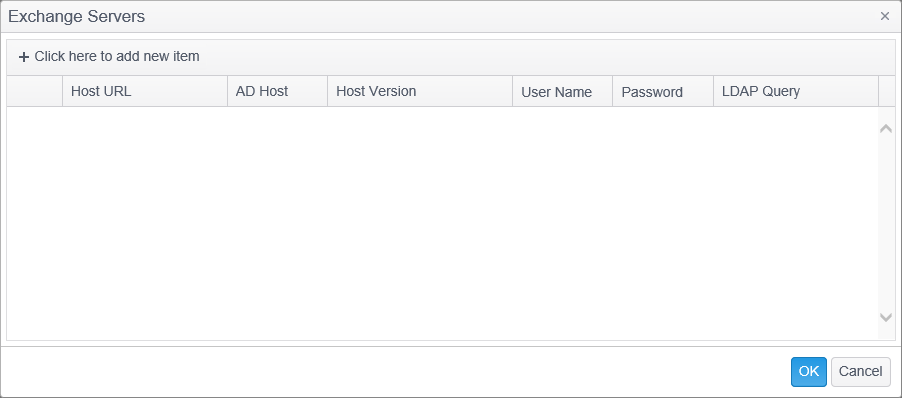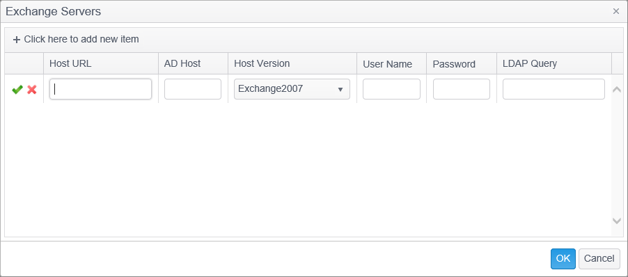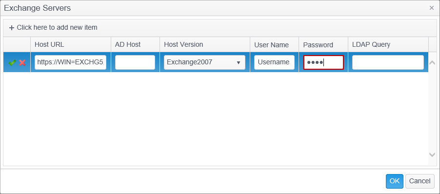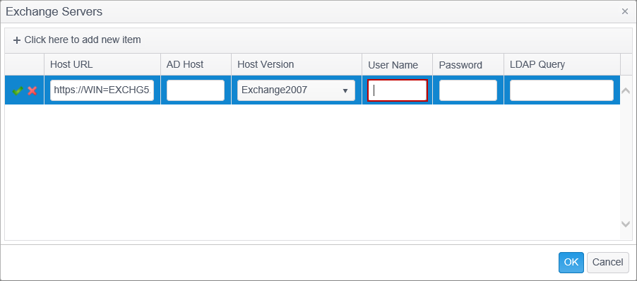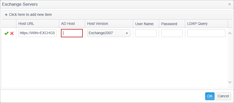 A new window opens when you click Edit Servers. Click where it reads, "Click here to add new item" to add an exchange server to the list.