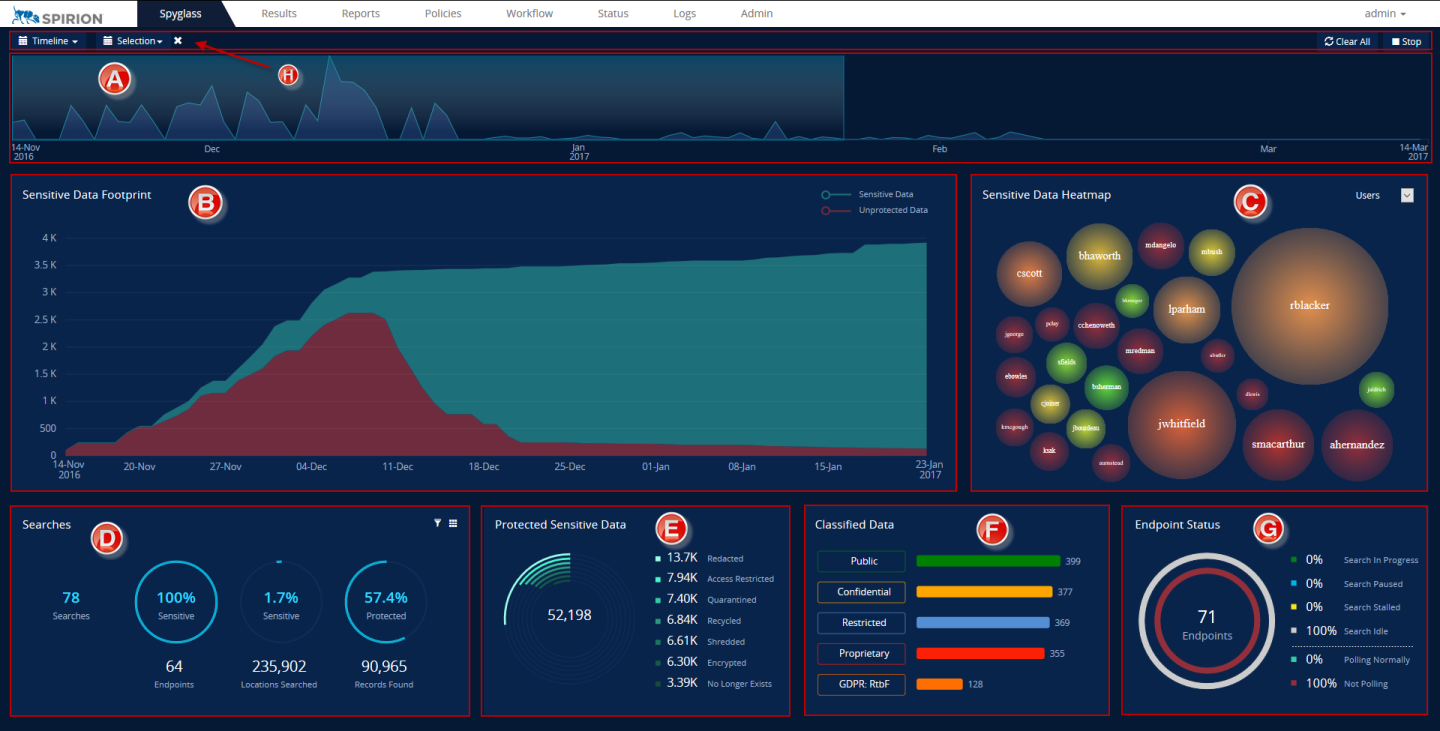 - Searches Widget: Shows the total number of searches that have been executed, number of managed endpoints searched, number of locations searched, number records found and the percentage of data that is protected.