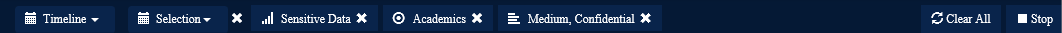 When a Timeline filter has been applied "Timeline" appears in the Filter Bar. Applying a Timeline filter updates the Timeline, Sensitive Data Footprint, Sensitive Data Heatmap, Searches, Protected Sensitive Data and Classified Data widgets to show only that information within the selected date range. To clear the Timeline filter to and show all available searches click the Timeline filter button and select All or select Clear All from the Filter Bar.