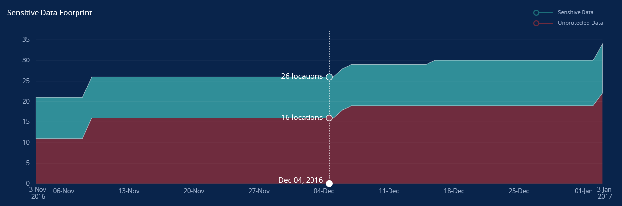 The Sensitive Data value represents the total number locations that contain matches. As you move the cursor left or right along the Sensitive Data Footprint widget, a vertical dotted line displays showing the date, the total number of locations searched on that date that contained matches, and the number of locations that contain unprotected data. In the screen shot above there was a search performed on December 04. In that search 26 locations were found to contain sensitive data and of those 26 locations 10 of them have since been protected leaving 16 locations unprotected.