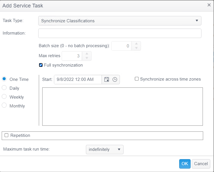 Select the Synchronize Classifications service task. Note: The option only displays here when you select the Synchronize classification changes with endpoints option on the Application Settings page of the Admin tab. |